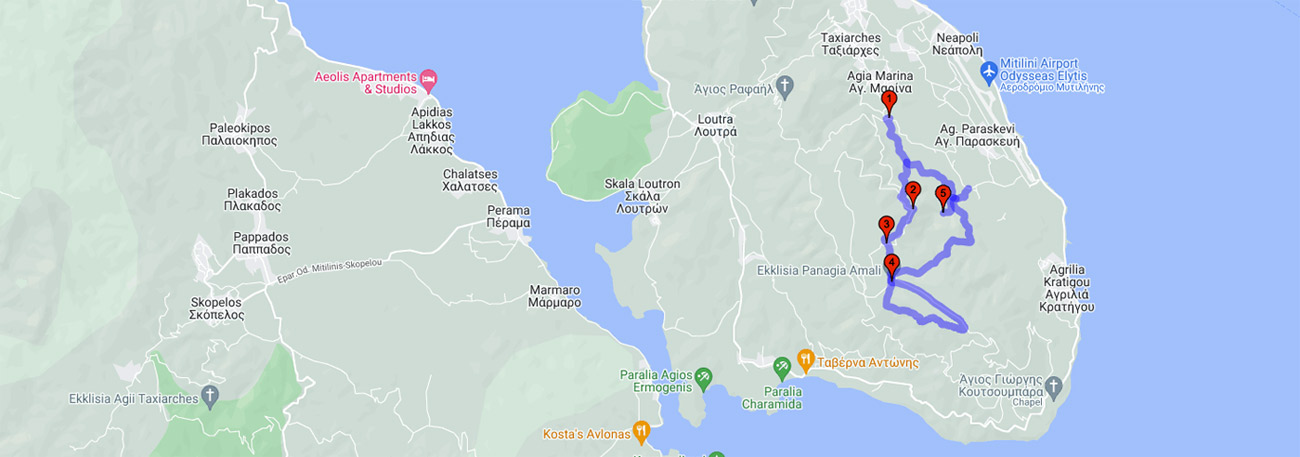 Η διαδρομή διασταυρώνεται με δύο ρυάκια και τρία ξύλινα γεφύρια που φτιάχτηκαν για να περνούν απέναντι οι πεζοπόροι. Στο 1/3 της διαδρομής (με εκκίνηση από την Αγία Μαρίνα), στο υψηλότερο σημείο της υπάρχει ένα κιόσκι με θέα το αεροδρόμιο του νησιού, την πόλη Μυτιλήνης, αλλά και την Παναγιούδα. Πιο κάτω υπάρχει μια παλιά λίμνη που γεμίζει ανάλογα με τις βροχοπτώσεις. |