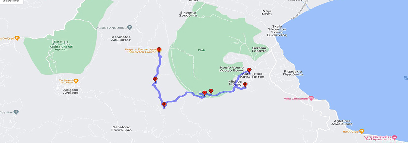 The route starts from the settlement of Kato Tritos in a western direction. The first stop on the route is the church of the Taxiarchs, which is a unique monument of the 16th century. Next, the pedestrian meets the settlement of Mychou. Further stops on the route are the marble cave of Fousa and the chapel of St. John the Theologian with its exceptional view of the bay of Geras. Continuing west, we come across the chapel of Panagia Trikherousa, which was built on the ruins of an ancient temple. From this point, the route moves north parallel to the winter stream of Andriotis in a lush landscape, passing through the chapel of the Taxiarchs in the area of Andria and ending up in the area of Agioi Anargyroi in a green landscape with recreational areas. |