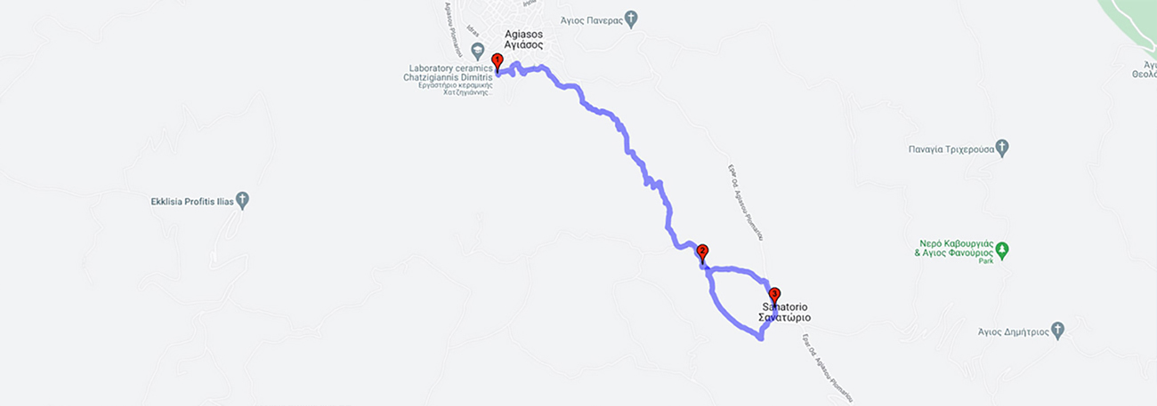 On the hiking trail that starts from Agiasos, there are four chapels: "Agios Ioannis," "Agios Konstantinos," "Astratgos" (Archistrategos-Taxiarchis), and "Panagiouda" (Birth of the Theotokos). The location of ancient Penthilis is defined by Astratgos, up to Panagiouda. It had inhabitants until 1701, when it was abandoned due to tax exemption in Agiasos, and today only the crops on terraces remain. The trail ascends through orchards with fruit trees and chestnut trees until it reaches Panagiouda and enters a pine forest. A small loop can be made towards the Sanatorium, where the asphalt road passes towards Agiasos and Megalochori. |
