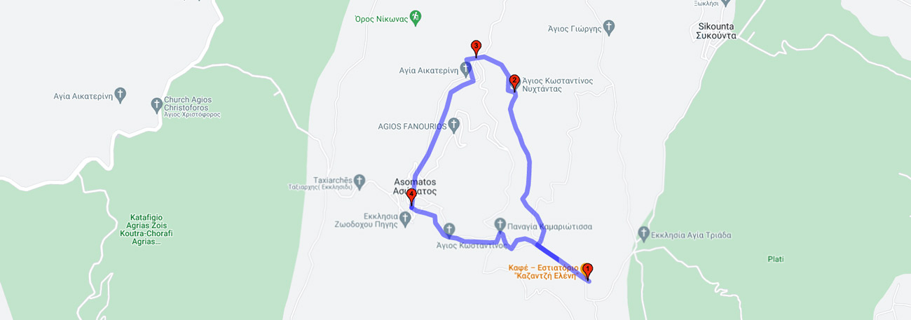 A mountain village with a plethora of legends and local traditions, Asomatos, is built next to the rocky mass of "Nikonas". At the entrance of the village, we find the school in a beautiful building. Continuing, we come across the market with cafes, bakeries - with the famous paximadia - and other shops. There are two olive presses and a flour mill. Walking along the cobbled streets, the visitor can admire the stone houses, the beautiful marble fountains, the picturesque cafes with the vines, the devout chapels, and generally an atmosphere that is genuine and at the same time different from that of the bustling city with its frantic pace.